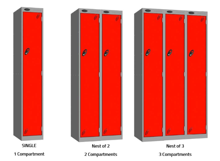 Lockers can be supplied as nested units with lockers of the same overall dimensions, sharing common side panels, manufactured and supplied fitted together. Locker nesting makes efficiencies in manufacture, delivery, installation and space utilisation. Important note regarding locker installations that wherever possible the lockers should be secured to ensure stability. Single lockers should ideally be fixed back to a wall. Runs of lockers should be fixed together side-to-side and either fixed back to a wall or fixed back-to-back to another run of lockers.
