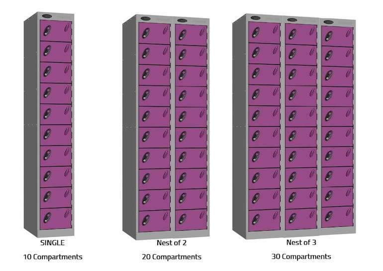Lockers can be supplied as nested units with lockers of the same overall dimensions, sharing common side panels, manufactured and supplied fitted together. Locker nesting makes efficiencies in manufacture, delivery, installation and space utilisation. Important note regarding locker installations Wherever possible lockers should be secured to ensure stability. Single lockers should ideally be fixed back to a wall. Runs of lockers should be fixed together side-to-side and either fixed back to a wall or fixed back-to-back to another run of lockers.